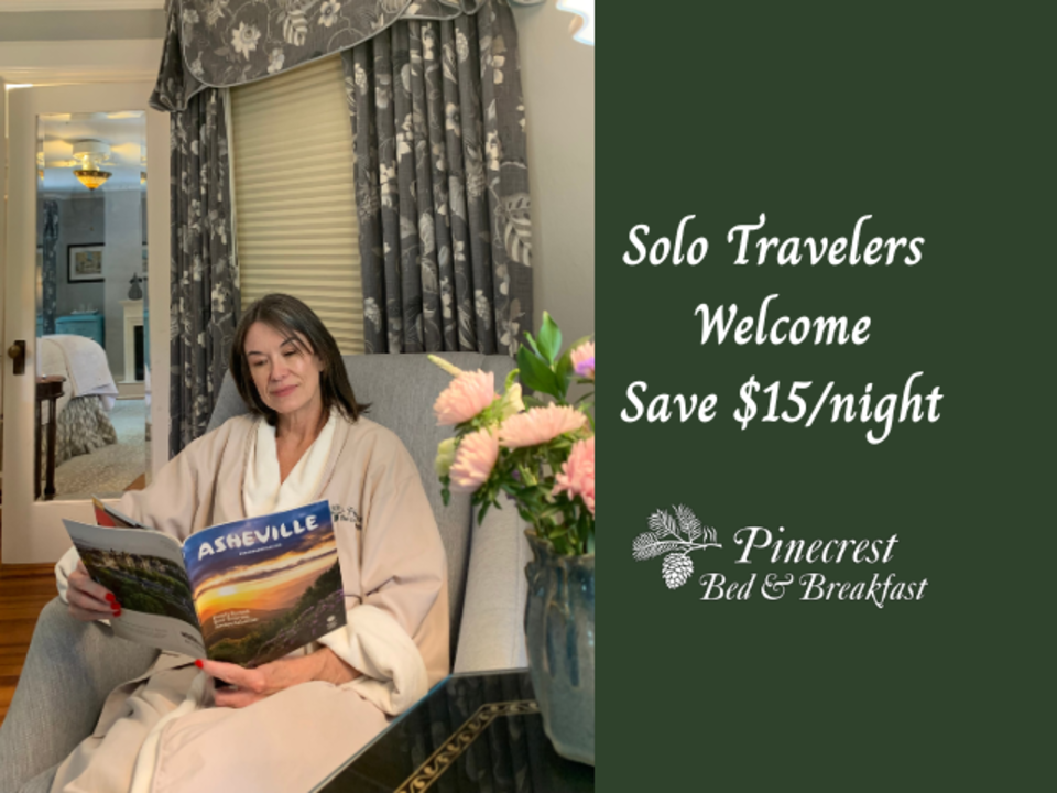 Pinecrest Bed & Breakfast in Asheville's historic Montford neighborhood welcomes solo travelers with a $15 per night discount off our Best Available Rate. Our five-room inn offers flexible breakfast options (community table, private parlor seating, or in-room delivery), free on-street parking steps from your door, cozy spaces including a sun porch and clawfoot tubs, and walkable access to downtown Asheville and local restaurants.
