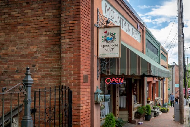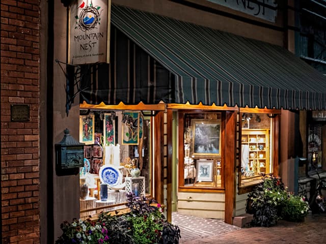 Come to Mountain Nest and find: original oil, acrylic, and watercolor paintings; fine art prints on both paper and canvas; handmade jewelry in silver, gold, and other fine metals; blown glass vessels and jewelry; beautiful and functional handmade pottery; and even more work in other mediums such as handmade wooden bowls, bark baskets, corn shuck dolls, natural fiber scarves, and steel metal sculptures.