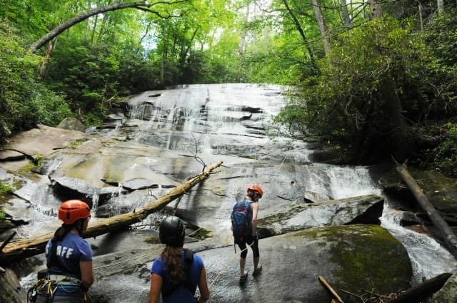 Canyoneering is an adventure sport that combines multiple outdoor adventures such as hiking, boulder-hopping, and waterfall rappelling to traverse down a canyon, typically formed by a river. Until recently, canyoneering in the United States has been accessible mostly in the Southwest, but exploration of the rivers and waterfalls throughout Western North Carolina has turned up exquisite canyons and pristine waterfalls perfectly suited to this emerging sport. FBA is thrilled to offer guests the opportunity to go where the average tourist will never get to go, and experience firsthand the waterfalls and river canyons that make this area so spectacular.