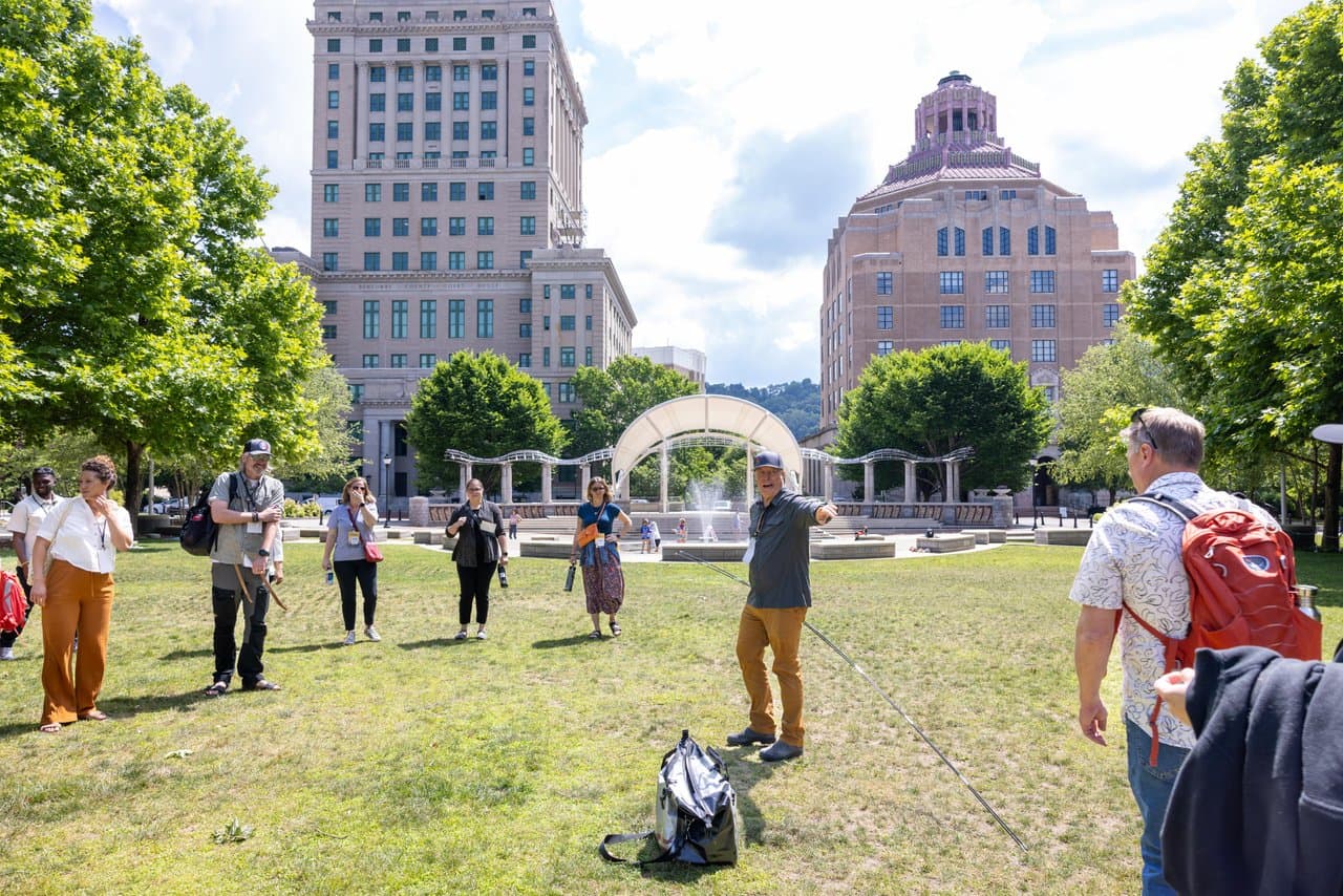 AdventureELEVATE attendees enjoy an outdoor session at downtown Asheville's Pack Square Park just steps from the host hotel.